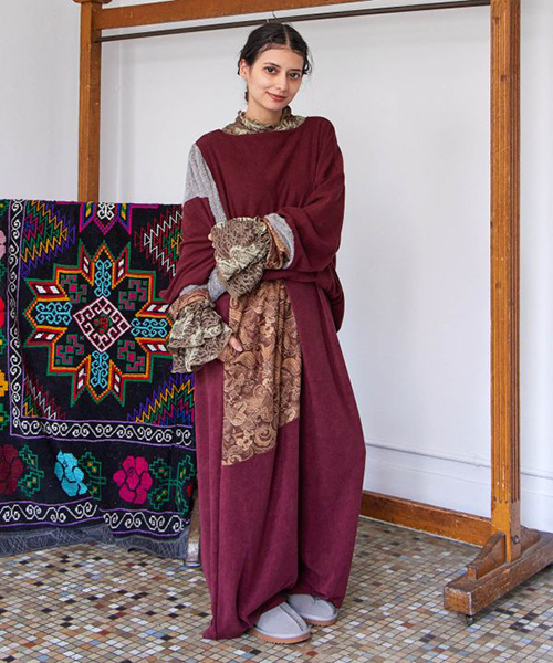 肌触りの良いパイル生地、ボアを組み合わせた、大胆なパッチワークが魅力のトップスとパンツ。