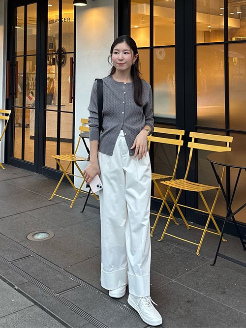 トップスは、今年のトレンドらしい短丈×衿つきのニットカーディガンをチョイス❣
