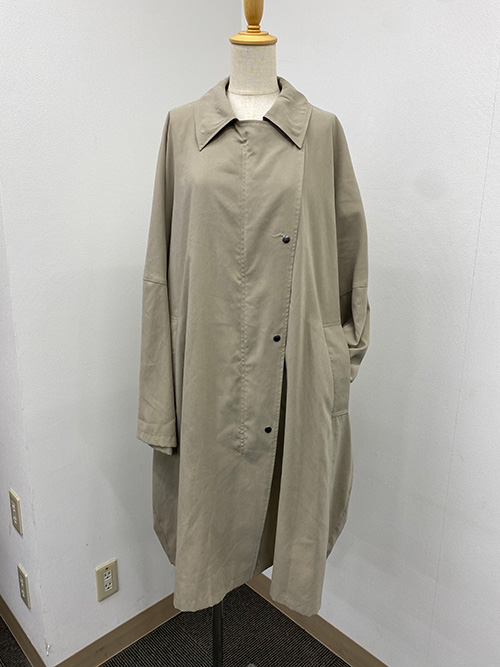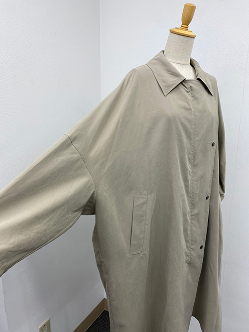 厚すぎない素材感で軽いので、ニットやシャツを中に着用してもごわつかないのでストレスフリーです。 程よいハリ感と落ち感がシンプルなのが魅力◎