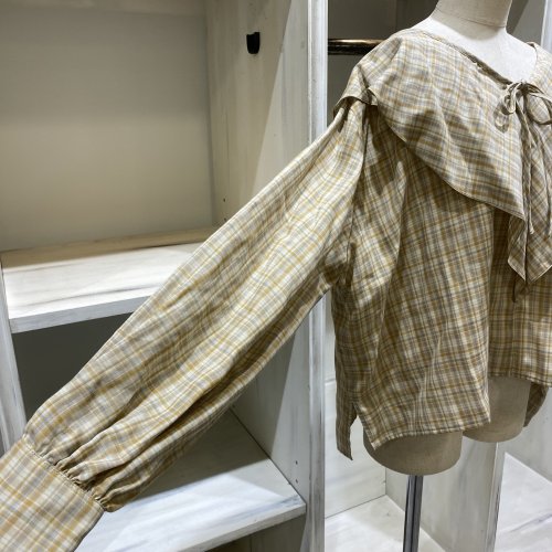 顔周りを華やかに見せてくれるビッグカラーと、柔らかなチェック柄がやさしい印象を演出してくれます。 ゆったり感とボリュームスリーブでリラックスした着心地をお楽しみいただけます。サロペットやジャケットとの合わせがおすすめです◎