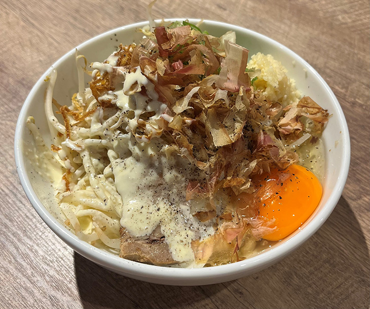 ガーリックマヨネーズ×フライドオニオン×背脂×生卵のハイパージャンクな二郎系まぜそばです