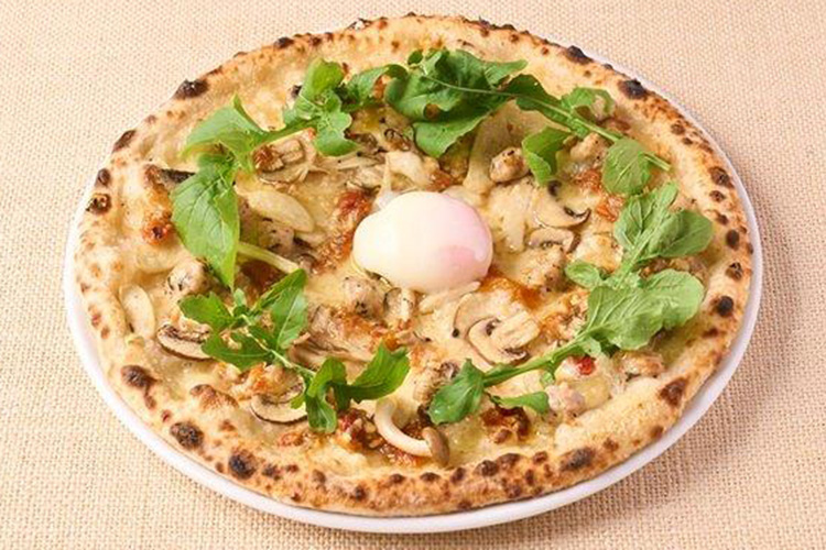 ガーリックが効いたドライトマトのソースにきのこ、サルシッチャ、チーズをのせ、香ばしく焼き上げた秋限定のピッツァ。ほんのり甘酸っぱく旨みの凝縮されたトマトのアクセントが全体を引き締め、中央に添えた温泉卵をくずせば、まろやかで奥行きのある味わいに。見た目も味わいも、秋の贅沢をぎゅっと閉じ込めた一枚です。