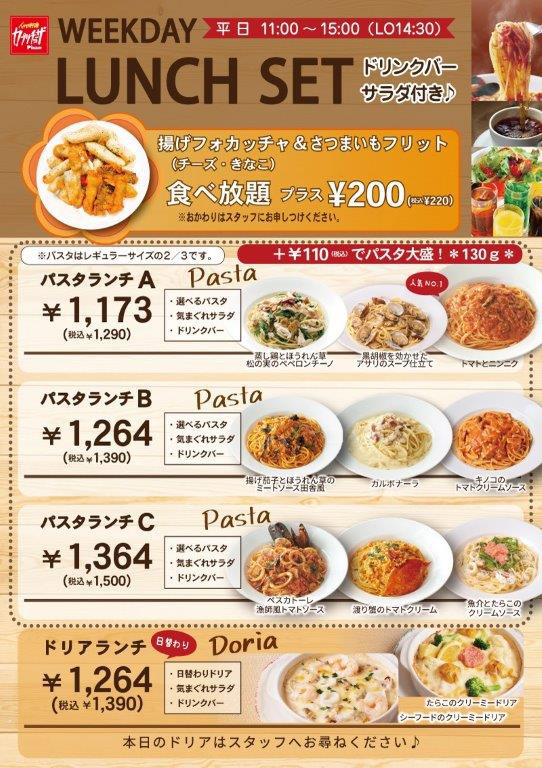 ※パスタはレギュラーサイズの2/3です。+¥110(税込)で大盛り出来ます。