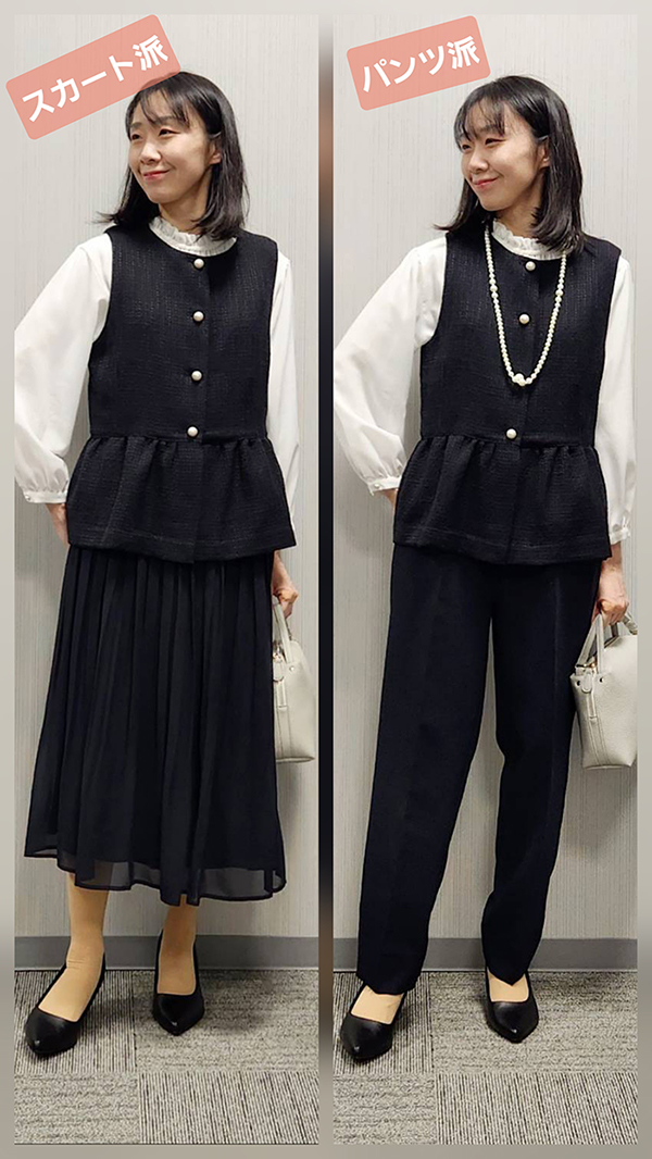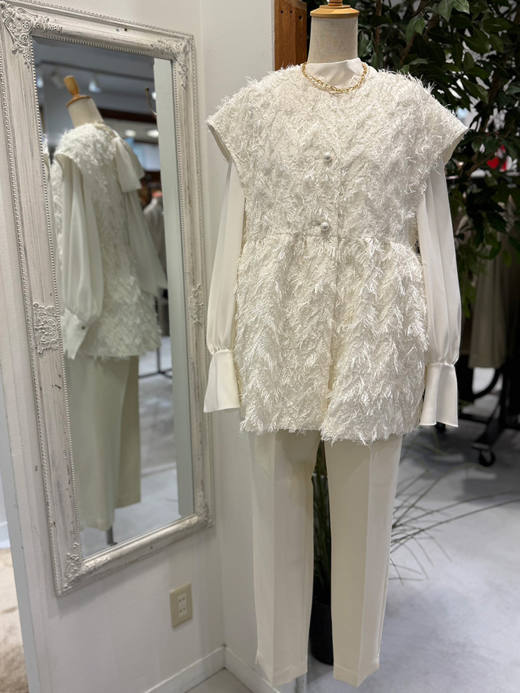 パールボタン付きツイードジレで、可愛さプラスでトレンド感もありデイリー使いもOKです。