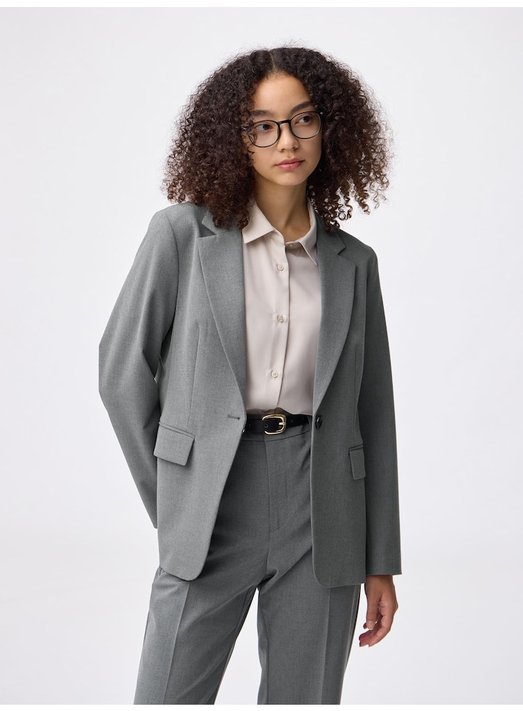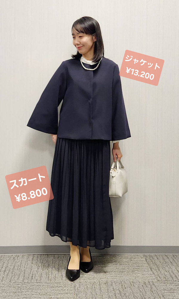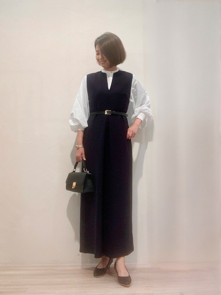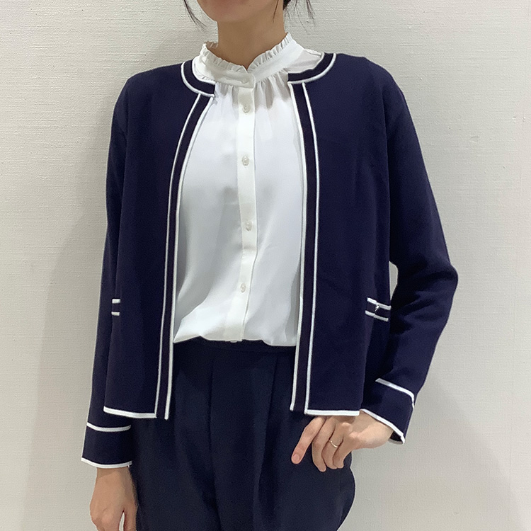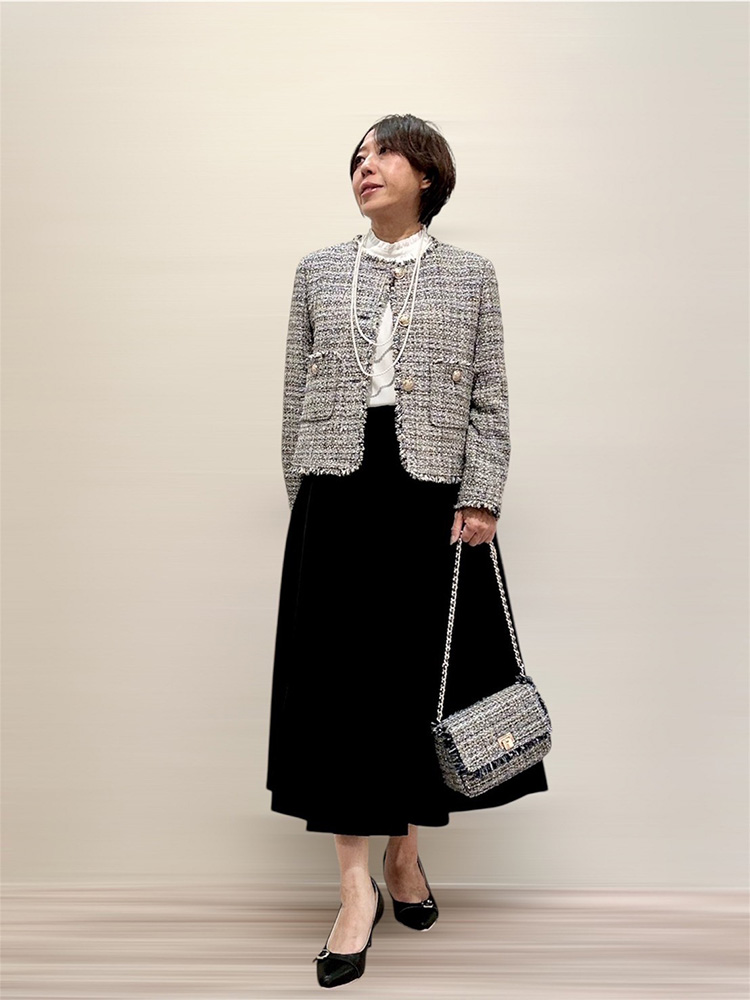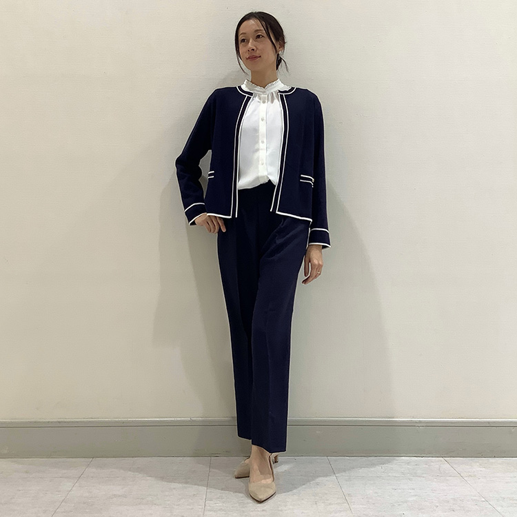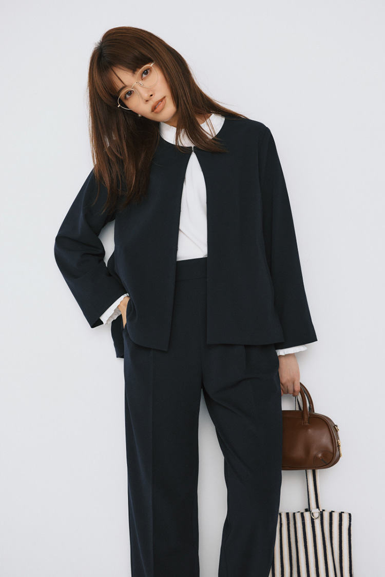 ジャケットの落ち着いたカラーリングでメリハリがある上品な印象に。