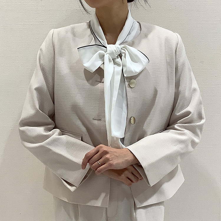 立体感のある織柄で光沢もあり、同じ素材のパンツとセットでも着られます。