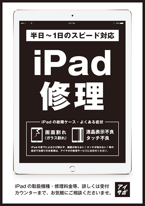 iPad修理は翌日以降のお渡しとなっております。