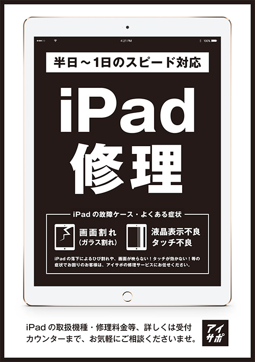 iPad修理は翌日以降のお渡しとなったおります。お見積りは無料です👍