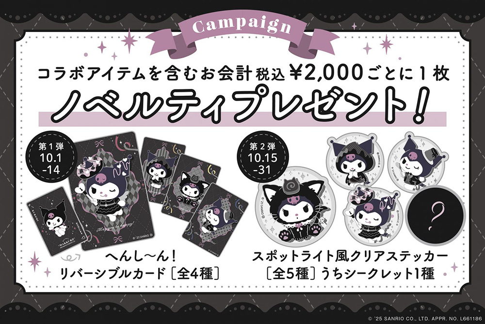 2025年10月1日(水)より、サンリオキャラクター「クロミ」とコラボレーションした新商品を期間限定で発売いたします。先着で「クロミ」のコラボ商品・グッズを含む 2,000 円(税込)ごとのお買い上げで、限定ノベルティをプレゼントいたします。期間により異なりますので、ぜひお見逃しなく。第1弾:2025年10月1日(水)〜なくなり次第終了