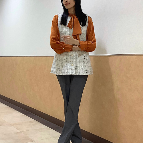 上品さと大人の可愛さを兼ね備えた、今期トレンドの長め丈ジレ。