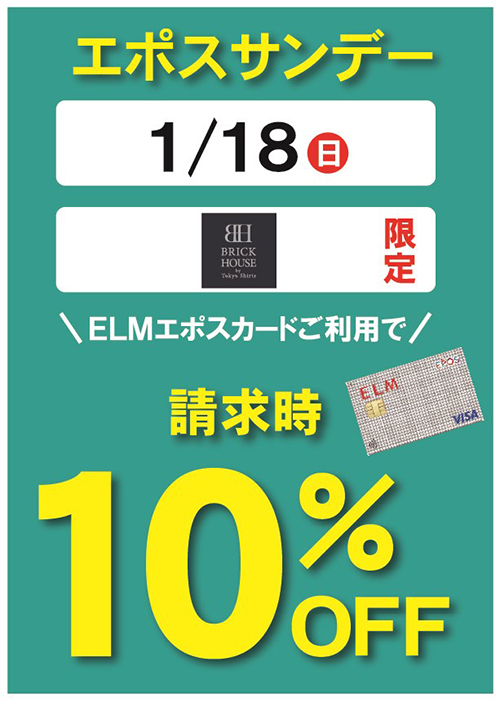 一日限りの1/18(日) エポスカードご利用請求時10%オフ♪