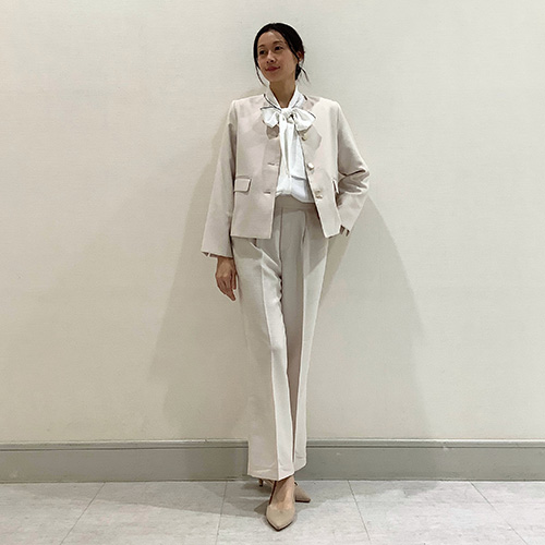 ご自宅の洗濯機で洗えちゃう、ジャケット・パンツのセットアップは春らしい軽やかな素材感。