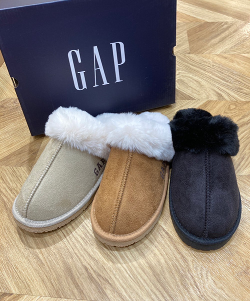 GAPのムートン風スリッパ。ボリューミーなファーとサイドの「GAP」ロゴがアクセントになったかわいいスリッパ。