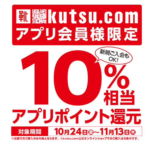 kutsu.comアプリ会員様限定のお得な企画を開催中です!期間中アプリのポイントがお買い上げ金額の10%相当還元です。