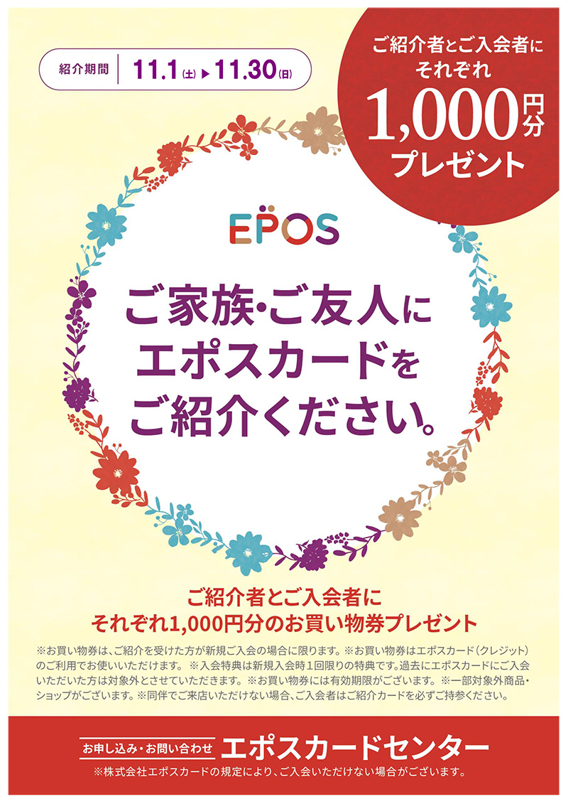期間:11月1日(土)〜11月30日(日)期間中、ご家族やご友人にエポスカードをご紹介いただき