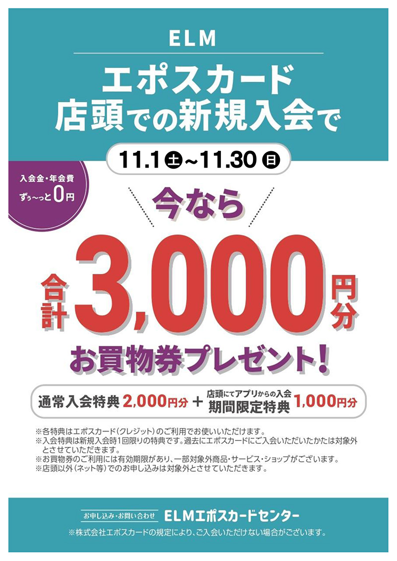 ※特典は、ELMエポスカードセンター店頭でのお申込みの方に限ります。