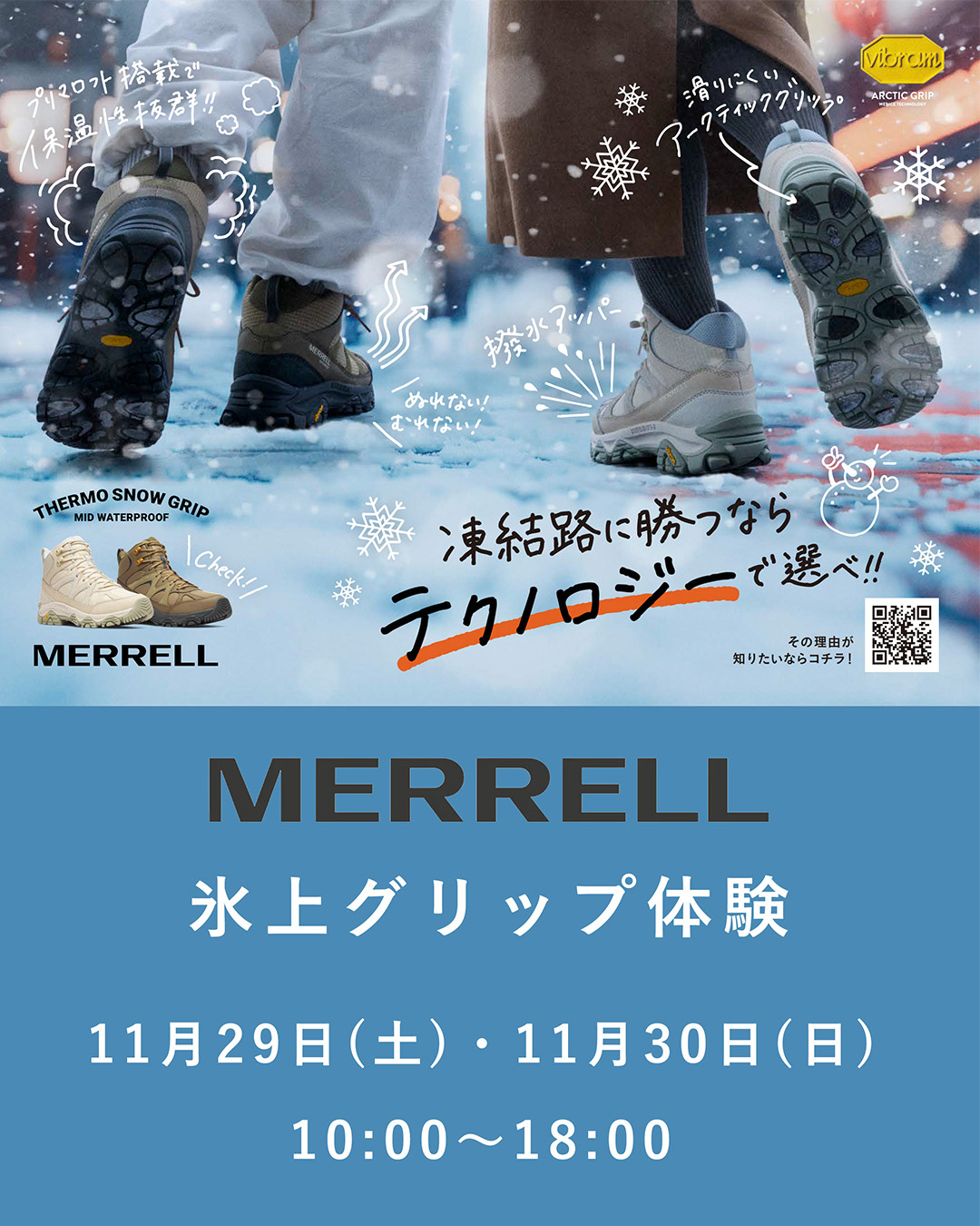 1/29(土)・11/30(日)の2日間、店舗前にて MERRELL(メレル)氷上グリップ体験会 を開催します!