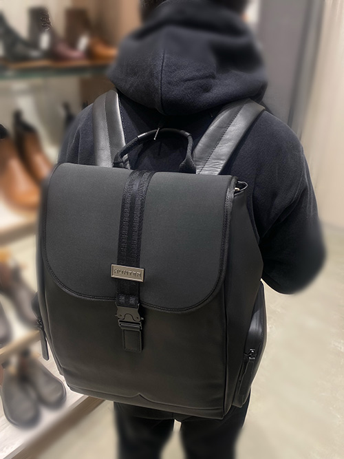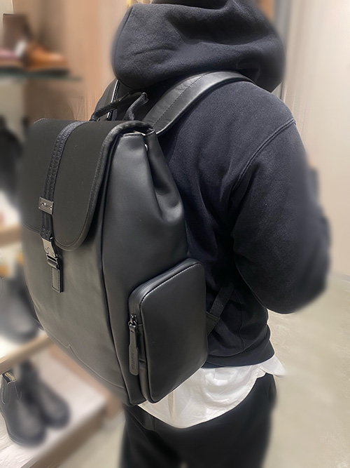 ★耐水性レザーとネオプレンを組み合わせ、少し雨が降っても安心★メタル素材のロゴと黒に統一されたデザインがスタイリッシュな印象に