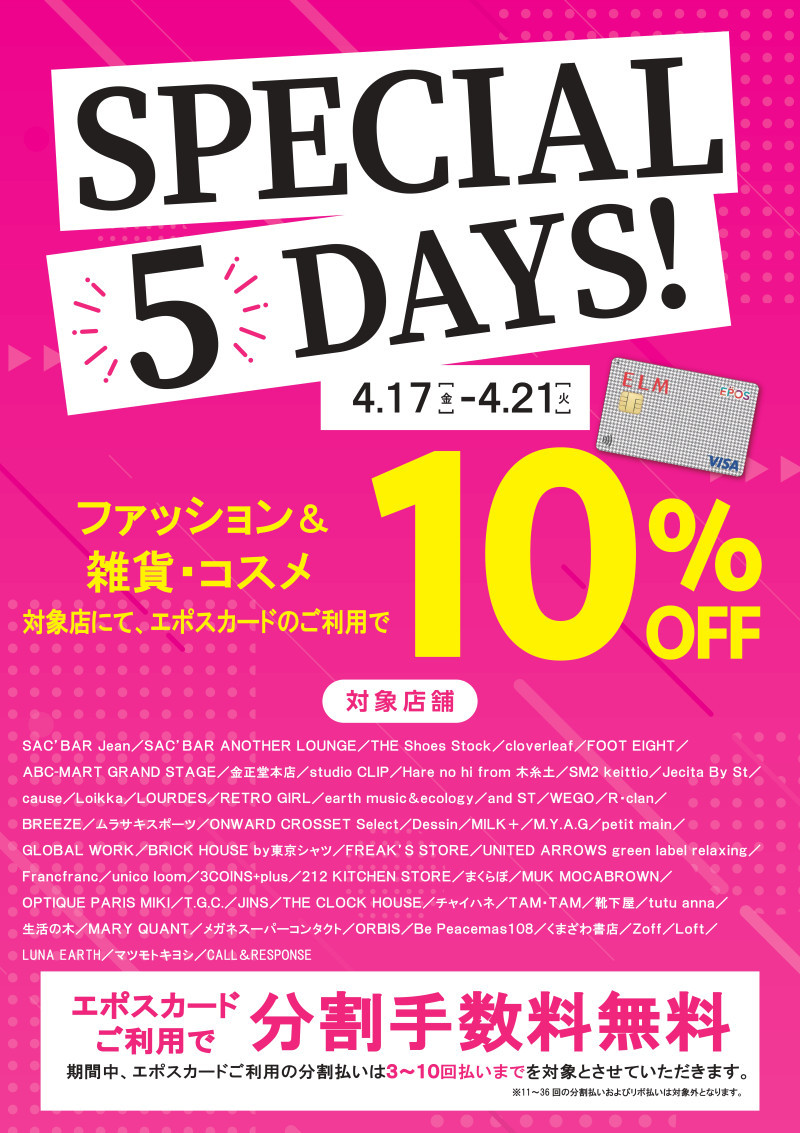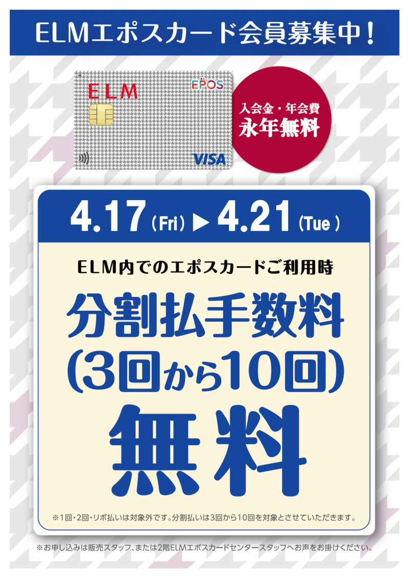 4/17(金)~4/21(火)の期間中、エポスカードのご利用で【請求時10%OFF】になるキャンペーンを開催しております✨