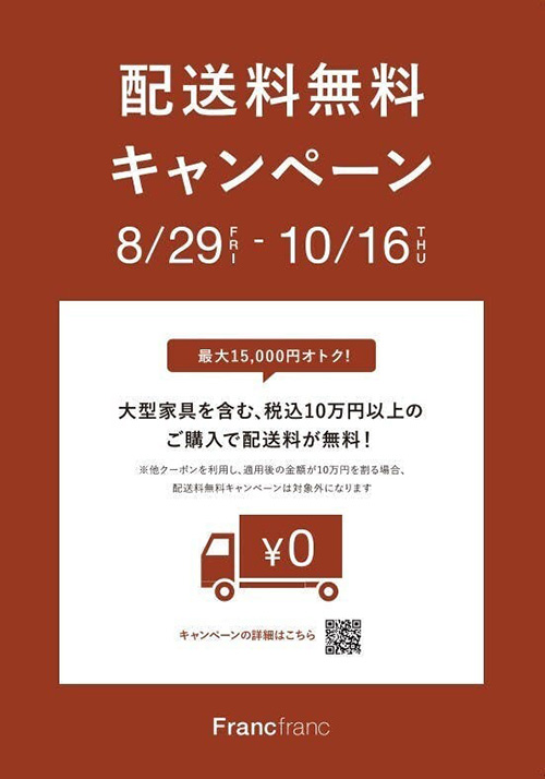 8月29日(金)~10月16日(木)までの期間限定で、家具を含む税込10万円以上のお買い物で配送料無料になるキャンペーンを実施中。