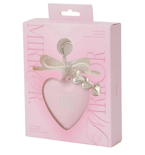 カラビナが付いているので、大きなハートのチャームとしてカバンに付けられ、開けるとミラーやブラシがセットになっているので、外でさっとリップや髪の毛を直したい時に便利✨
