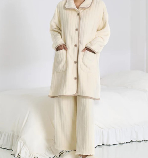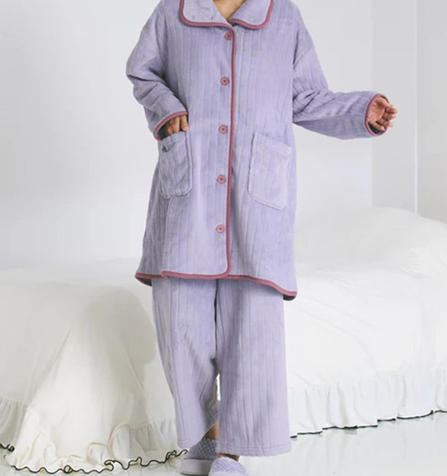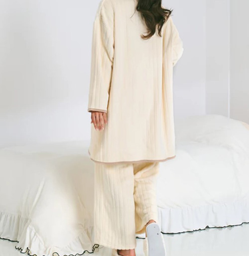 室内コートのようにゆったりと羽織れるトップスと、同素材のボトムがセットになった暖かいルームウェアです。