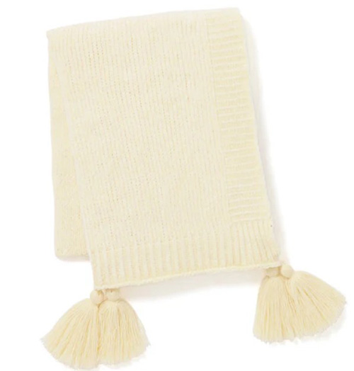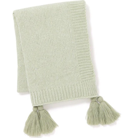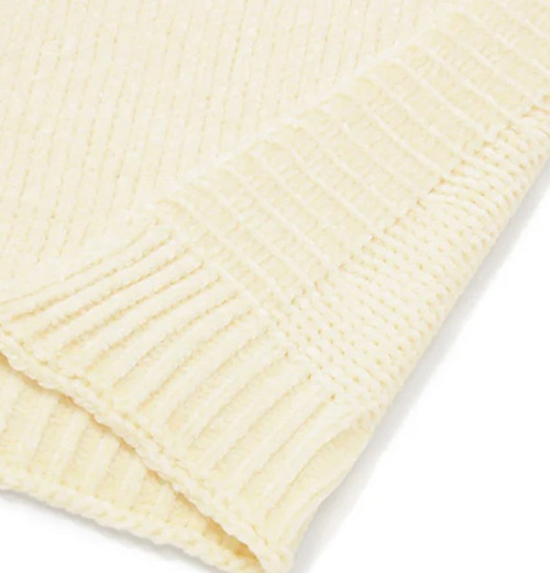 光沢感のあるモール糸で編み上げた、ふわふわとしたやわらかな肌触りのスロー(ひざ掛け)です。