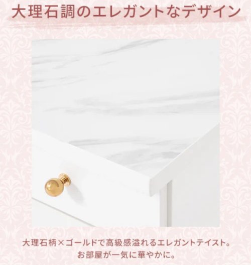 人気の大理石模様をあしらった天板と清潔感のあるホワイトのチェストが調和したコスメデスクはFrancfrancらしさあふれる上品なデザインが魅力。
