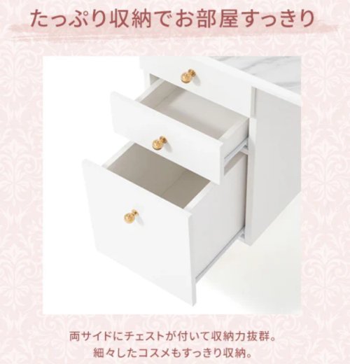 メイクに必要な道具をすべて収納できる圧倒的な収納力で、両サイドに配置したチェストは上段2段が浅めでこまごましたコスメの収納にぴったり。