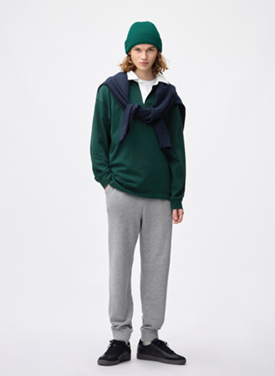 程よいふくらみのある裏毛スウェット素材で、リラックス感のあるテーパードシルエットが特徴です。ルームウェアとしても普段着としてもおすすめなアイテムです。皆様のお越しをお待ちしております。