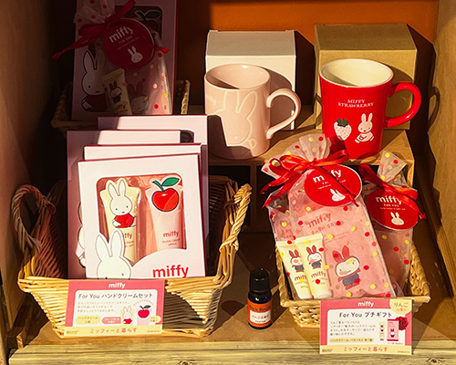 大人気のミッフィーコーナーに、甘酸っぱく濃厚なりんごの香りが楽しめるギフトセットが入荷しました!・バスソルト、ボディウォッシュ、バススポンジが入ったバスセットスクエア缶 ¥1980(税込)