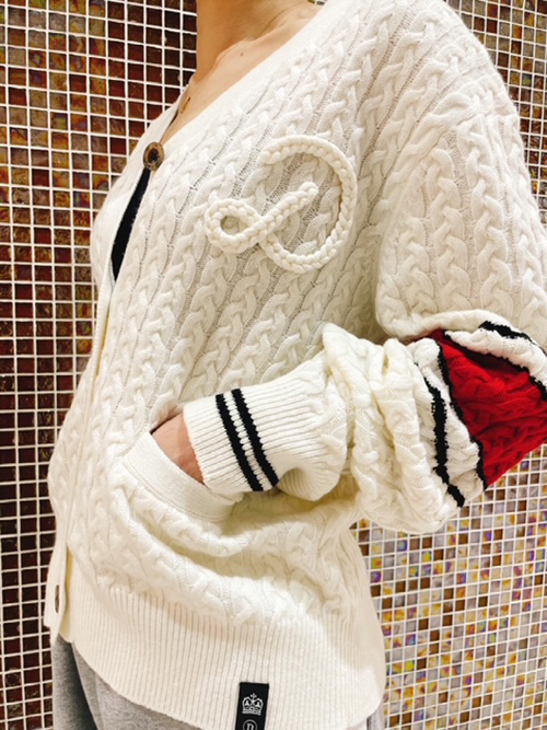 ケーブル編みの柄がヴィンテージライクなカーデ☺︎三つ編みの「D」ロゴがアクセント👌