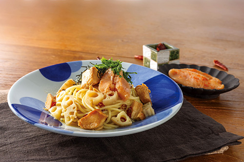 はかた地どりと博多明太子のペペロンチーノ ¥1,490(税込¥1,639)⇒旨み豊かなはかた地どりと、ピリッと辛い博多明太子を合わせた贅沢なペペロンチーノ