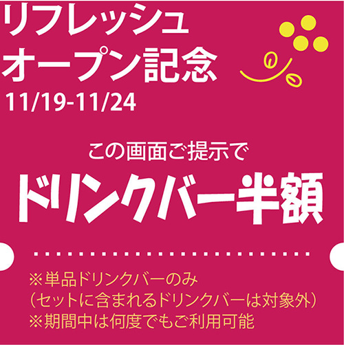 リフレッシュオープンに伴い11/19(水)〜11/24(月)までこの画面ご提示でドリンクバーを半額いたします!