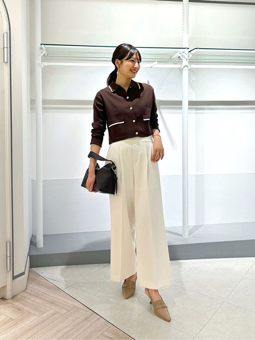 トップスは、今年のトレンドらしい短丈×衿つきのニットカーディガンをチョイス❣