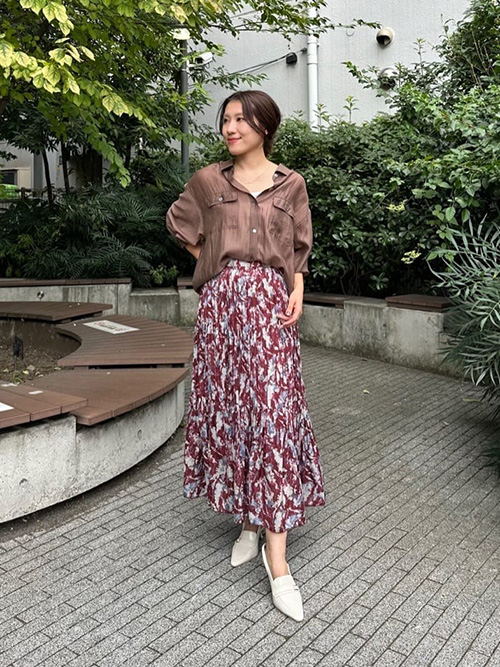 ボトムは、上品な花柄プリントスカートをチョイス。