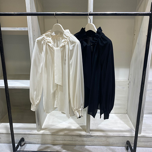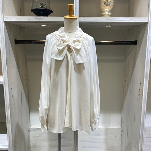 首元にたっぷり寄せたギャザーと、縦に落ちるリボンタイが印象的なブラウス。