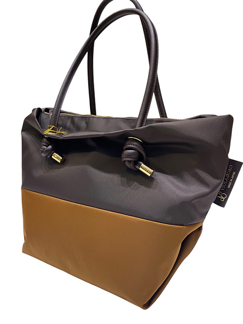 バイカラーのナイロンボディにノットハンドルがアクセントになったトートバッグのMサイズ。内側は3層に分かれており、ファスナーを閉めたままアオリポケットにスマホやパスなどを収納できるので通勤などで安心してお使い頂けます。