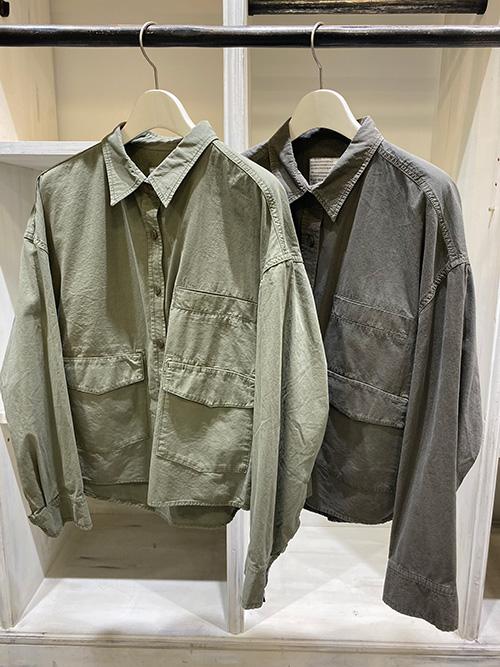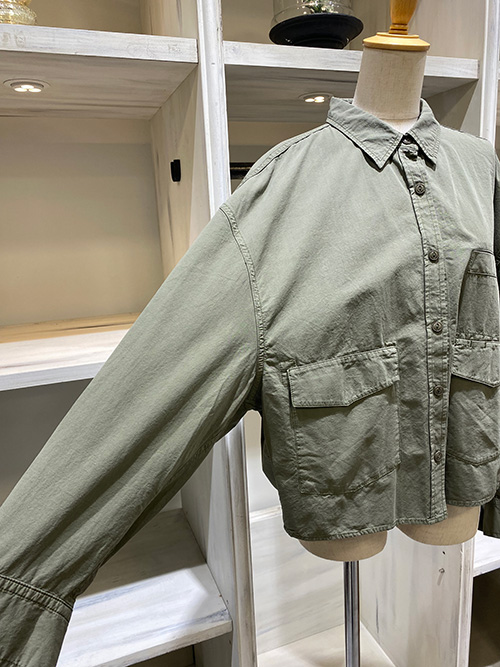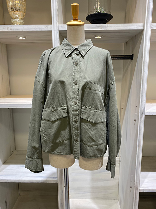 大きなフラップ付きの貼りポケットがミリタリーテイスト、肩周りがゆとりのあるドロップショルダーにワイドスリーブ、袖口はカフス仕様になっております。