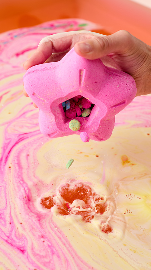 スーパースターの中に入った、様々な色のコンフェッティをお湯に浮かべてみましょう。