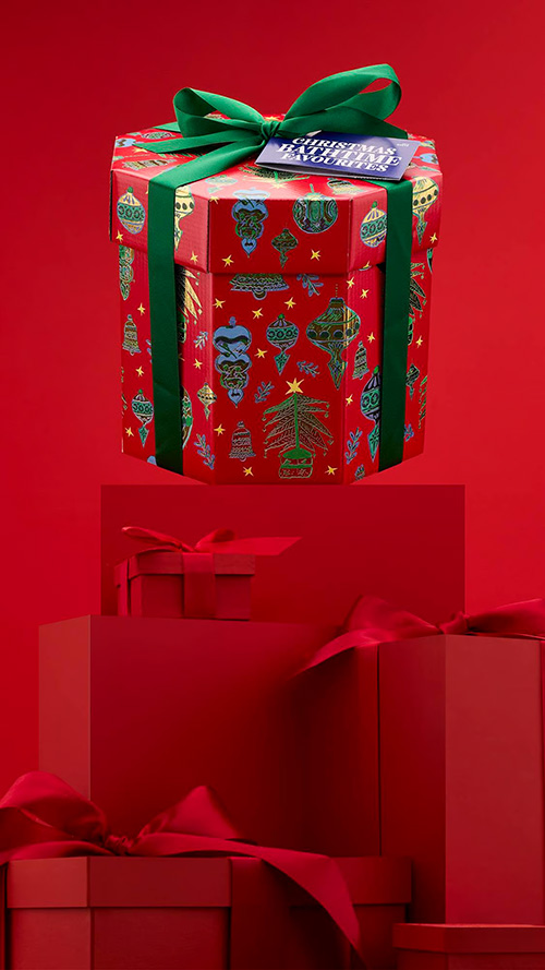 『クリスマスバスタイムフェイバリット ギフト』があれば、バスタイムがパーティータイムに早変わり! 雪の妖精が輝く渦を巻き起こしたり、ペンギンと踊ったり、もちろんあの人もゲストリストに名を連ねています。