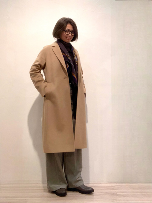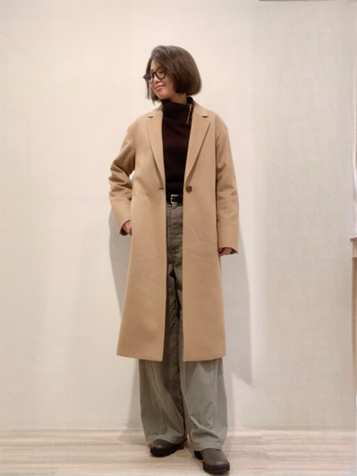・ウールカシミアビーバーチェスターコート長すぎない着丈なので、パンツはもちろん、スカートやワンピースとのスタイリングもしやすいです。ストールやマフラーでアレンジしやすいのもポイント。