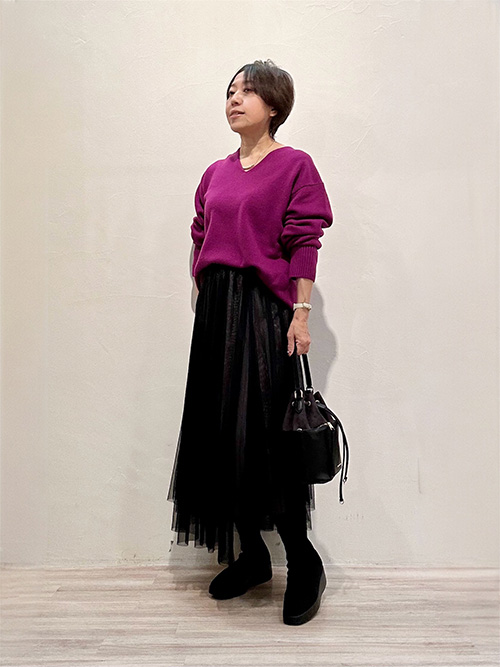 首元をすっきり見せながら、ふんわり暖かさも備えるニット。