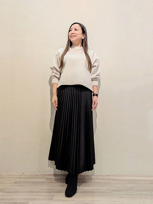 プリーツが上品に揺れるフレアシルエット