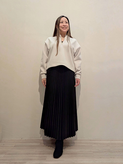 ZIPを前にして首元スッキリ、キレイ目に