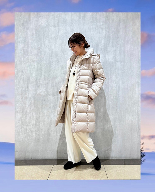 ヒップが隠れる丈感で暖かく、女性らしいシルエットも兼ね備えた真冬まで大活躍するロングダウンコートです。