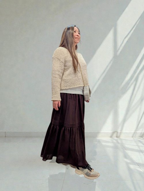 さりげなく煌めくラメ素材が上品で、大人のカジュアルに華やかさをプラス。