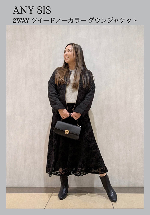 ★【洗える】2WAY ツイードノーカラー ダウンジャケット