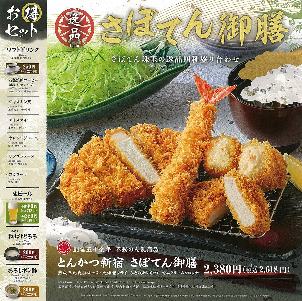 創業40余年。全国に店舗を展開するとんかつ専門店。さぼてんブランドポーク『sabo RED』をはじめ、期間限定商品など、お料理をお楽しみいただけます。すぐに、お持ち帰り頂ける、お弁当、かつサンドもご用意して皆様のご来店をお待ちしております。