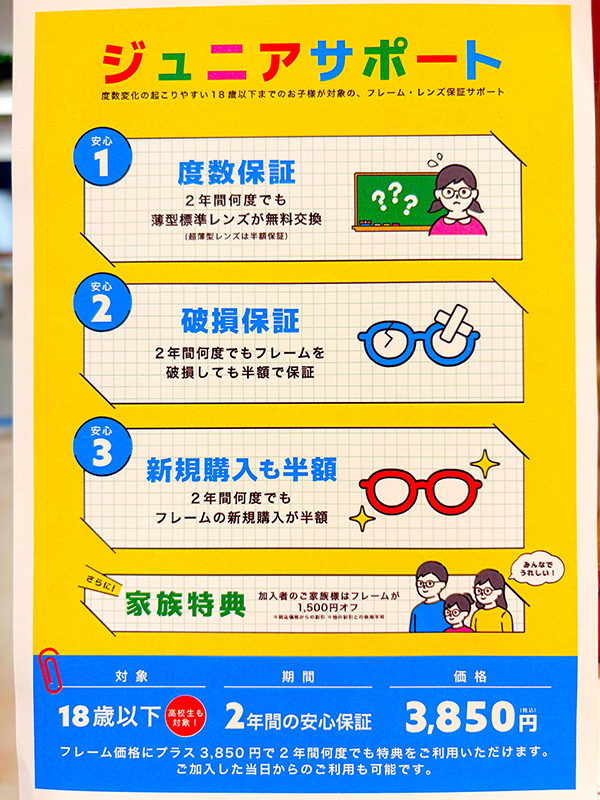 【ジュニアサポート】フレーム価格にプラス3,850円で2年間何度でも下記の特典をご利用頂けます。